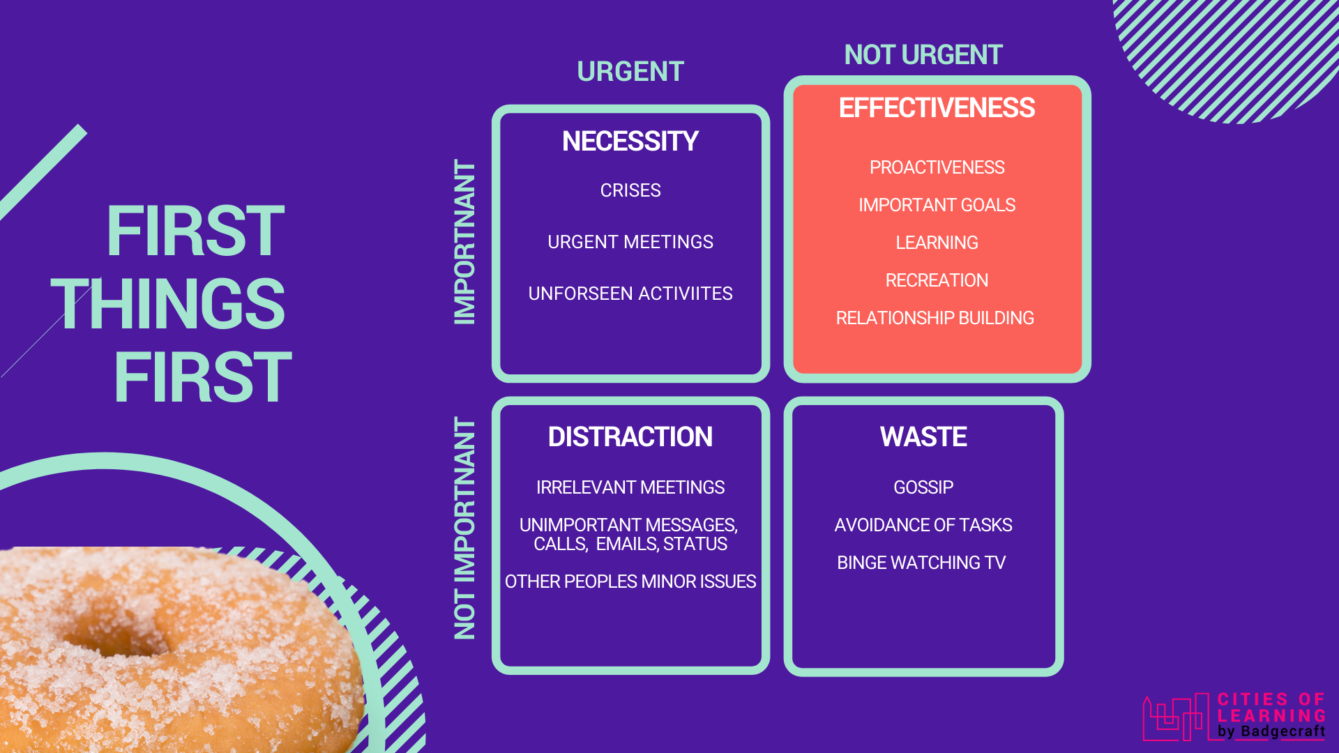In youth work, this habit encourages both youth workers and young people to make intentional decisions about how they use their time, attention, and effort. It invites reflection on what tasks, relationships, and goals align with core values — and which distractions or pressures might pull us away from them.