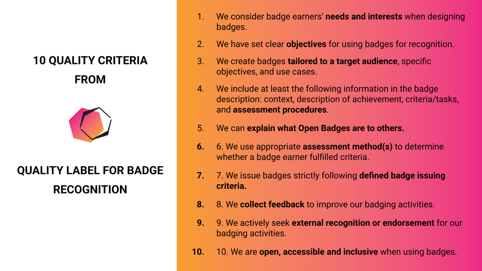 This day clearly showed that quality in badging is rooted in the initial design but is equally dependent on the operational flow. This brings us to the Quality Label for Badge Recognition Criteria, which must be considered when designing, issuing, assessing, and implementing badging within your organisation.