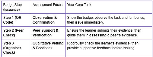 For these badges, the learners are responsible for assessing each other's work (evidence submitted by a third party). Your role is purely guidance and process verification.